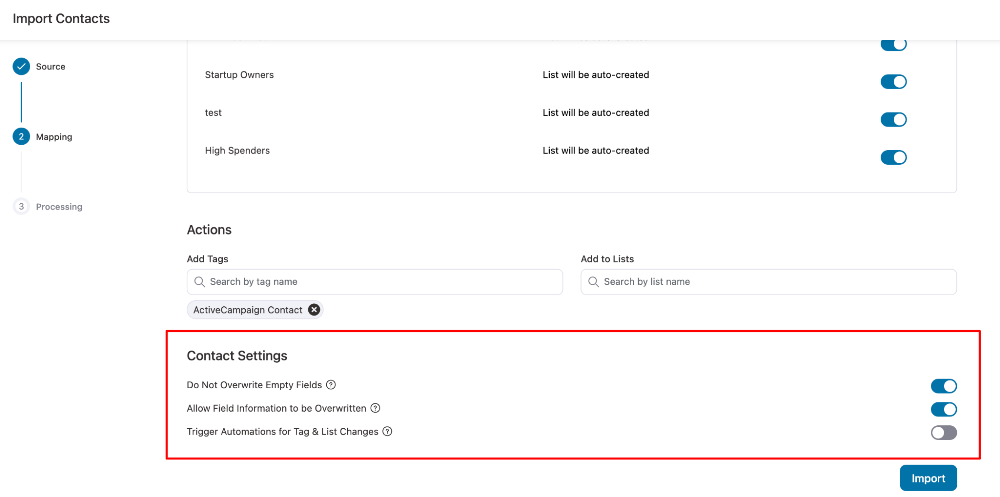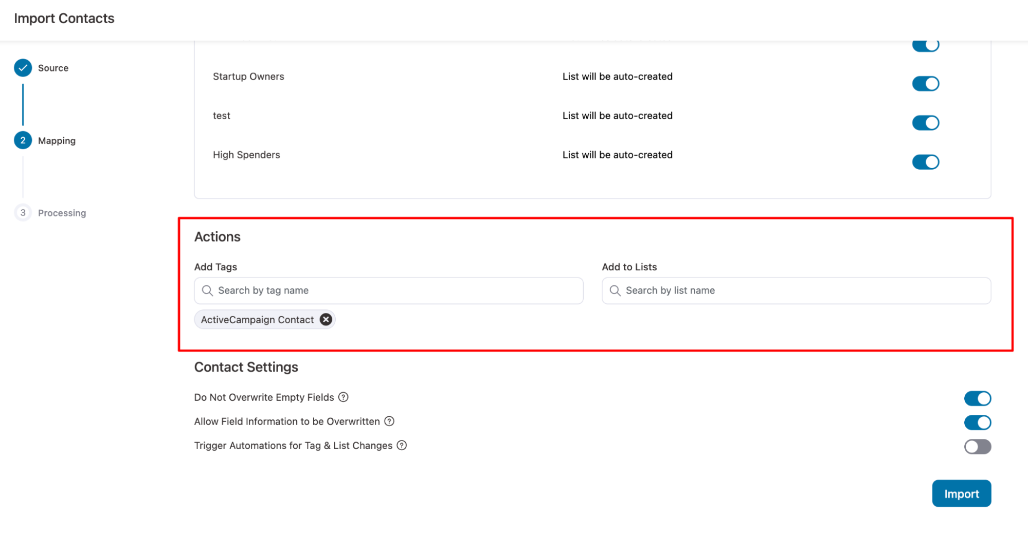 - Trigger Automations for Tag & List Changes: Enables automation workflows to run when a contact’s tag or list is updated during import.
