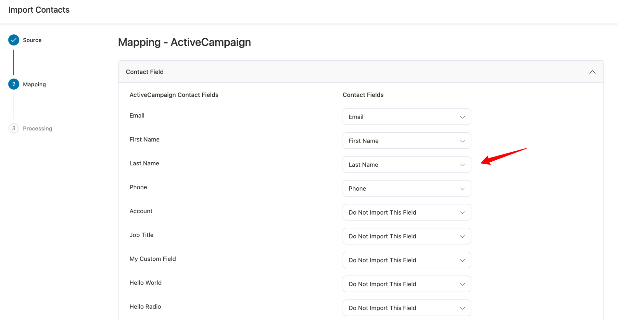 Next, you need to map the contacts. Mapping allows you to accurately store your fields in FunnelKit Automations by linking ActiveCampaign data to the appropriate fields where you want it saved.