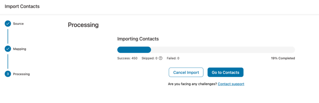 Please wait for a few seconds, depending on the number of contacts. You will find a progress bar of how many contacts were skipped, failed, or successfully imported.