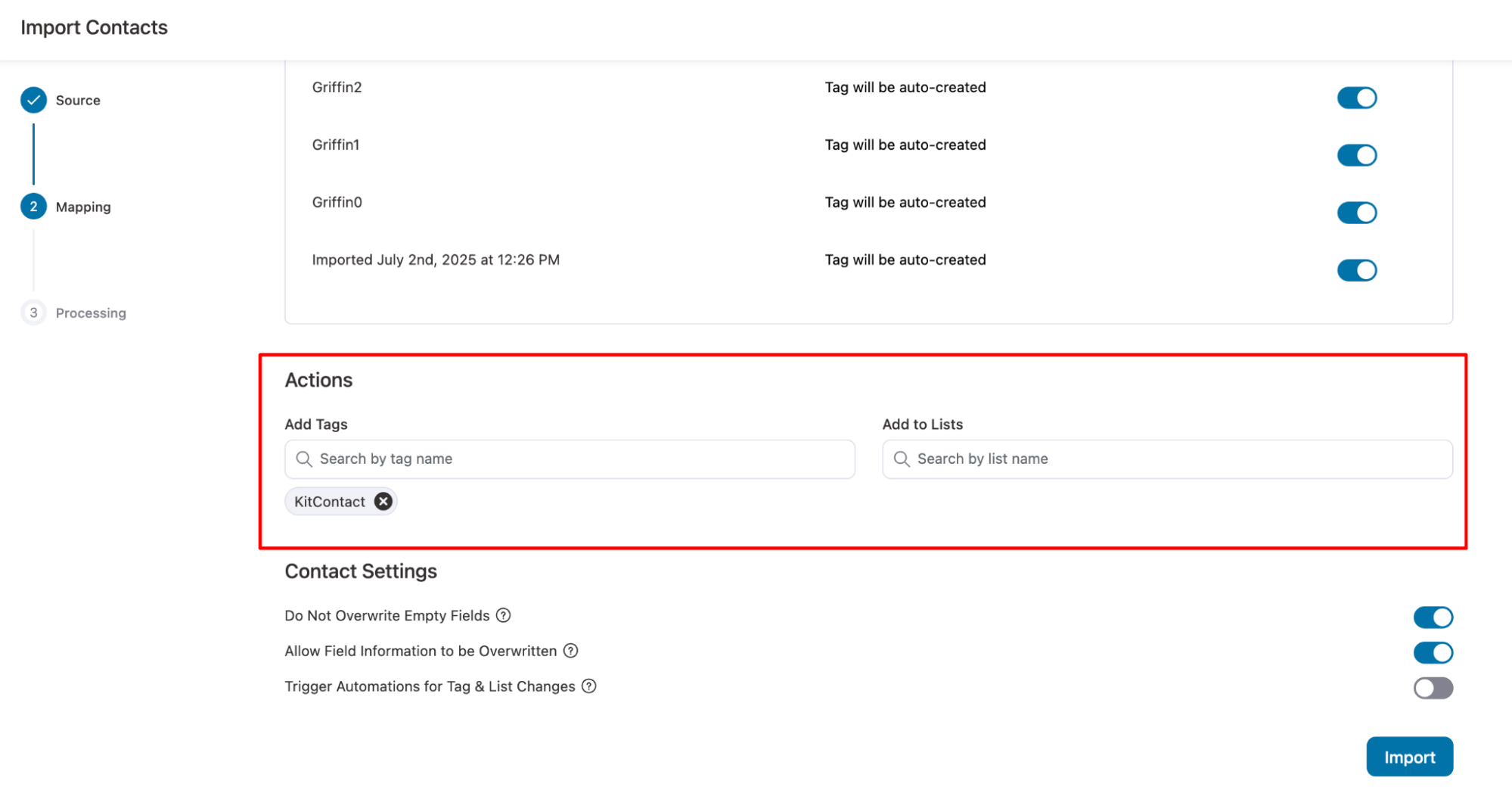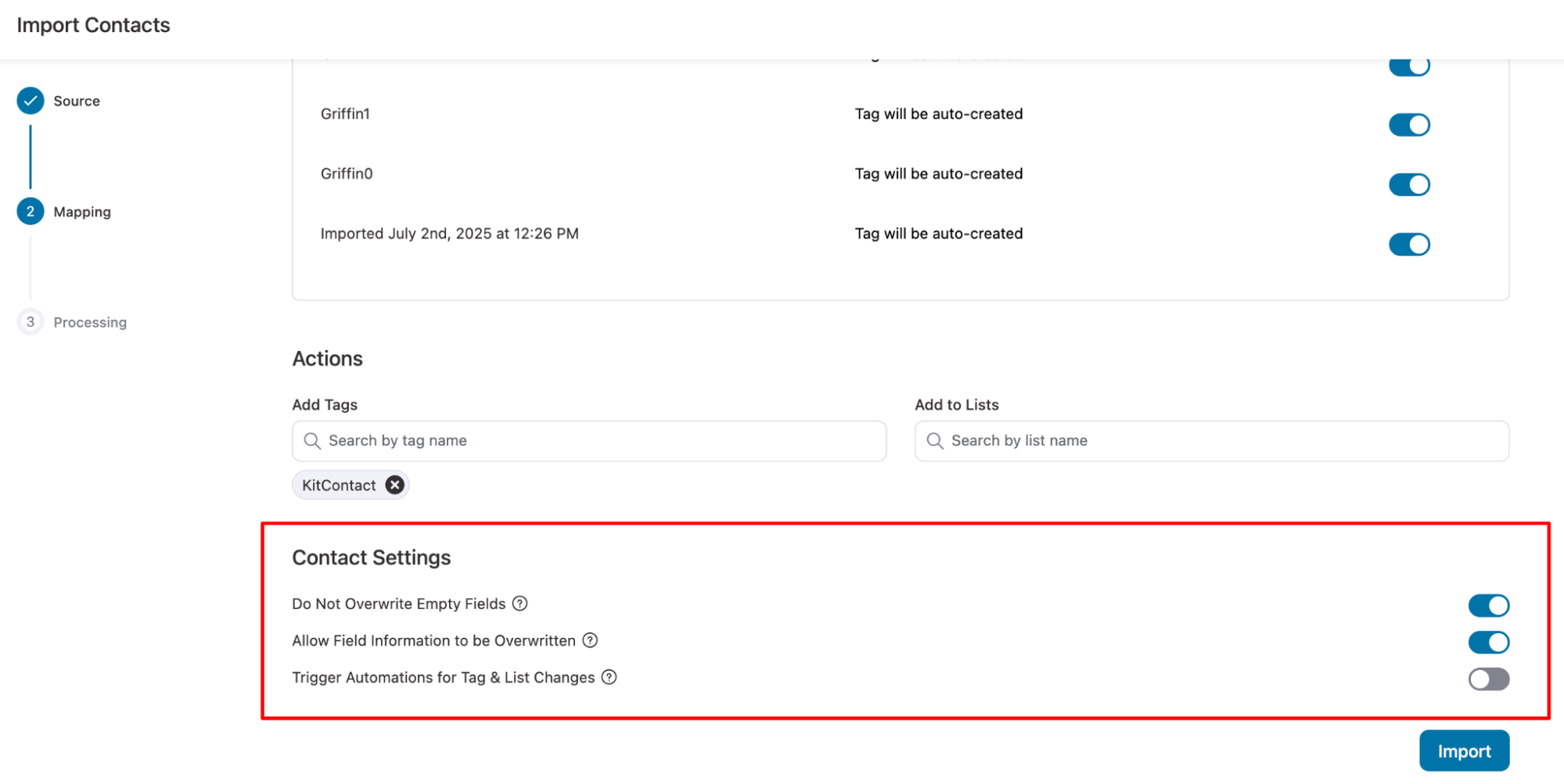- Trigger Automations for Tag & List Changes: Enables automation workflows to run when a contact’s tag or list is updated during import.