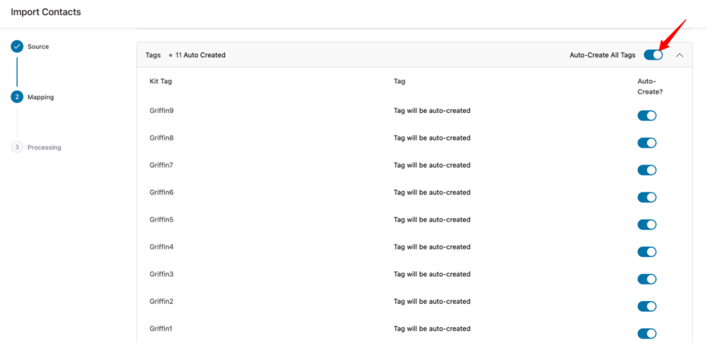 To auto-generate tags, enable the 'Auto-Create All Tags' option. If you prefer to generate only specific tags, disable the ones you don’t want to create.