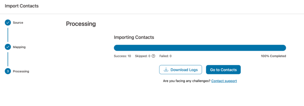 Please wait for a few seconds, depending on the number of contacts. You will find a progress bar of how many contacts were skipped, failed, or successfully imported.