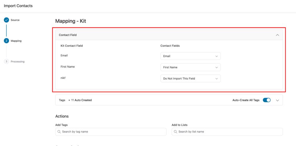 Next, you need to map the contacts. Mapping allows you to accurately store your fields in FunnelKit Automations by linking Kit data to the appropriate fields where you want it saved.
