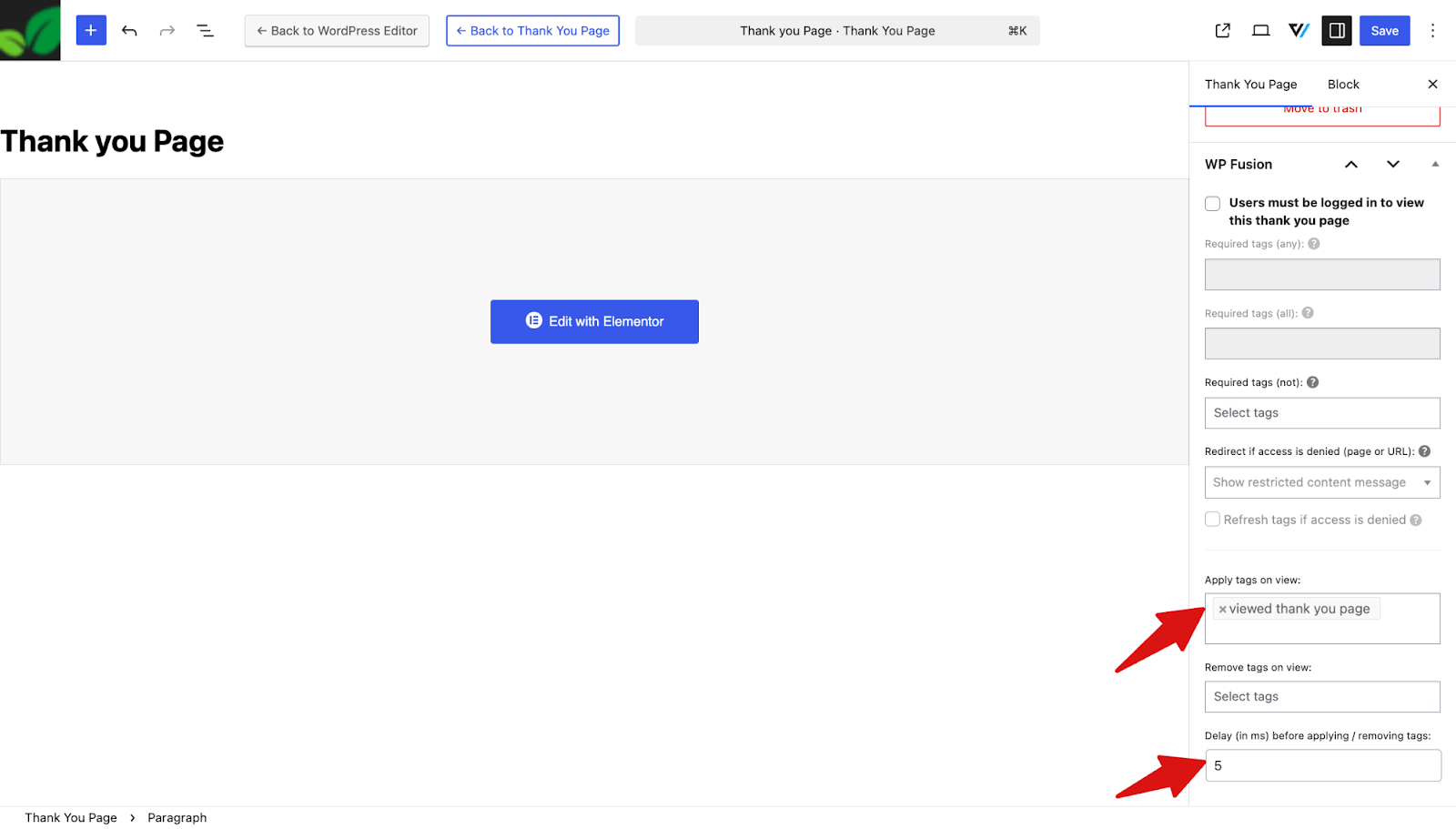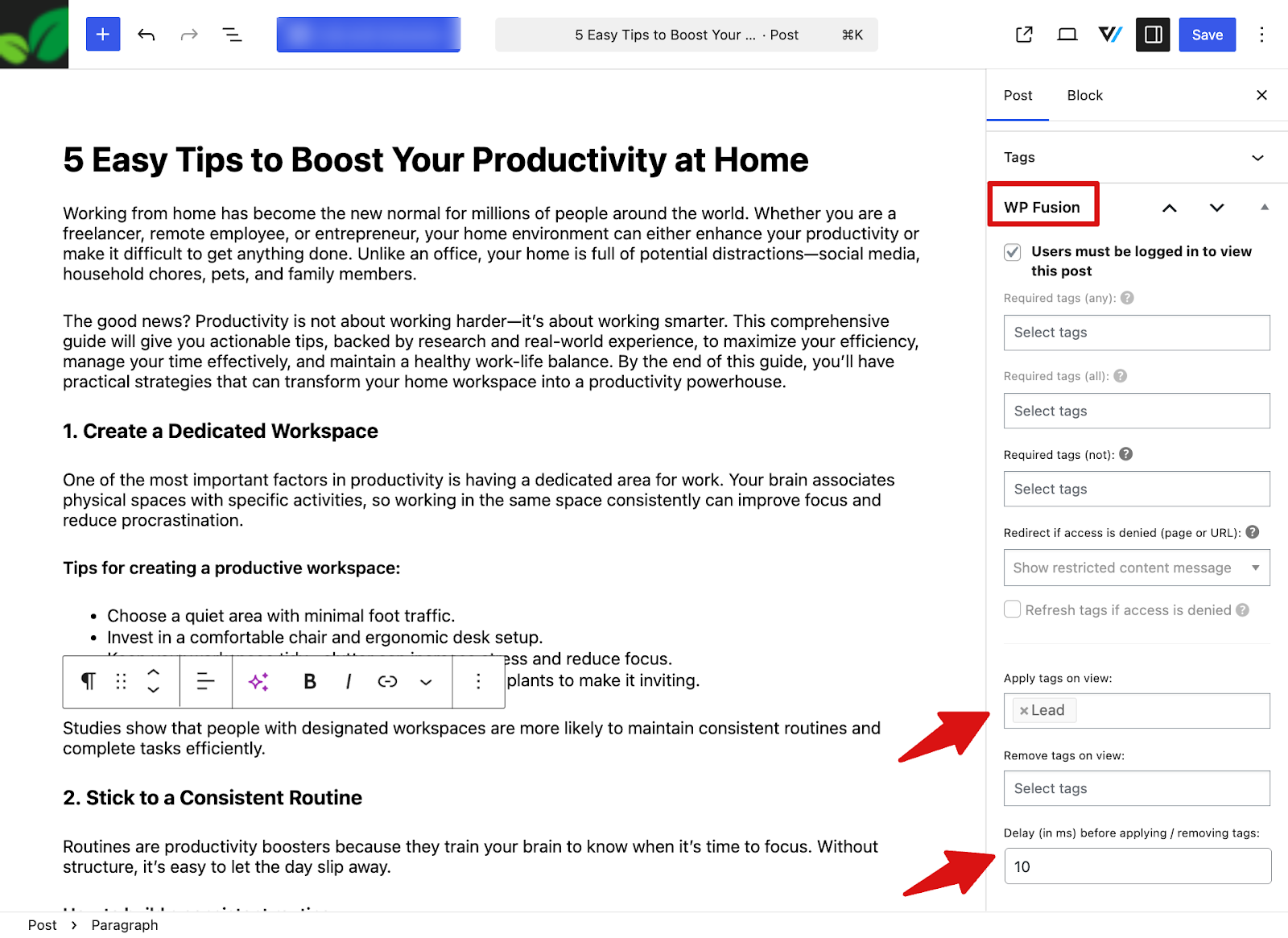 When a known contact views a WordPress post that has WP Fusion tags assigned, the plugin detects the page view and automatically applies the configured tags to the contact. The delay ensures that the page has loaded before the tags are applied.