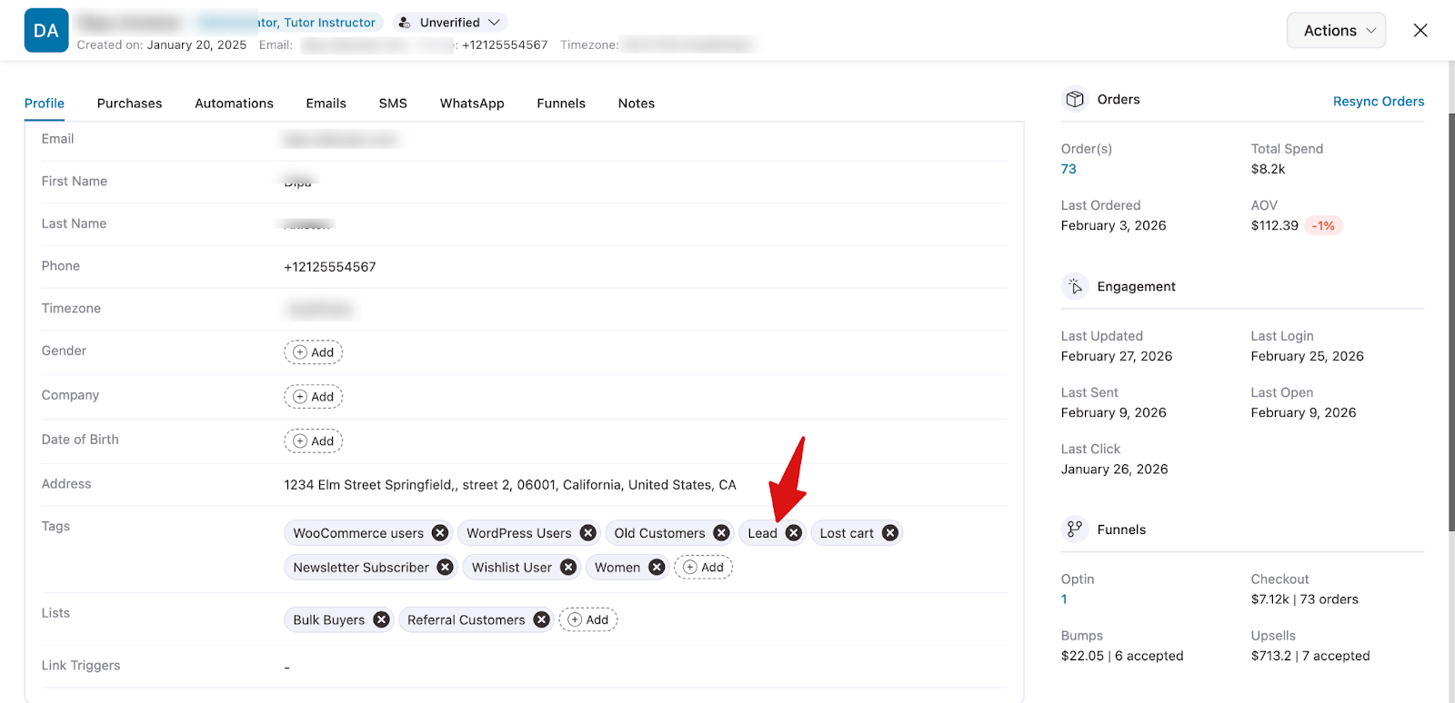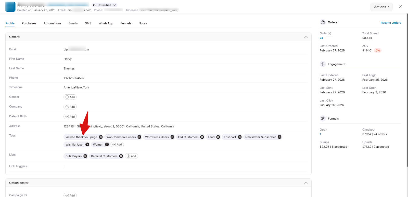 Now try placing an order from a FunnelKit contact email, and when you visit the thank-you page, a tag will be added under contact.