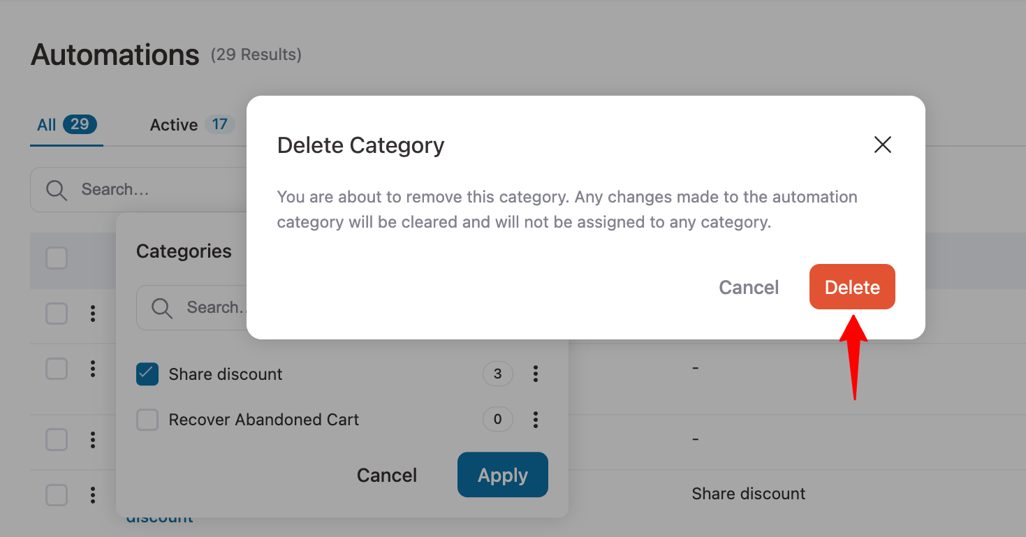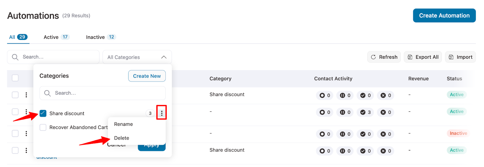 To delete any automation category, select it, then click on ⋮ it, and hit the delete option.
