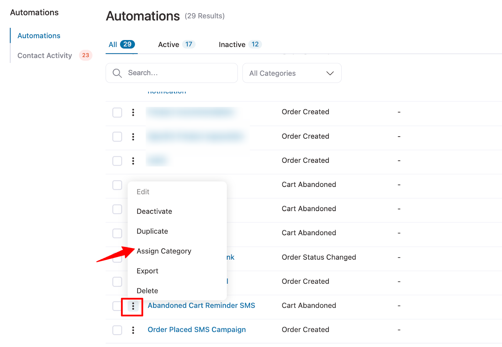 To add a category to automation, click the ⋮ sign and select Assign Category.
