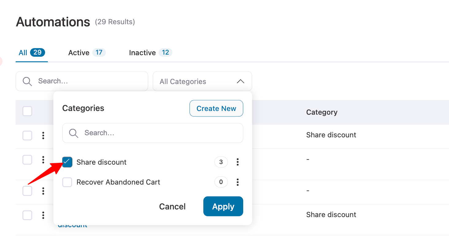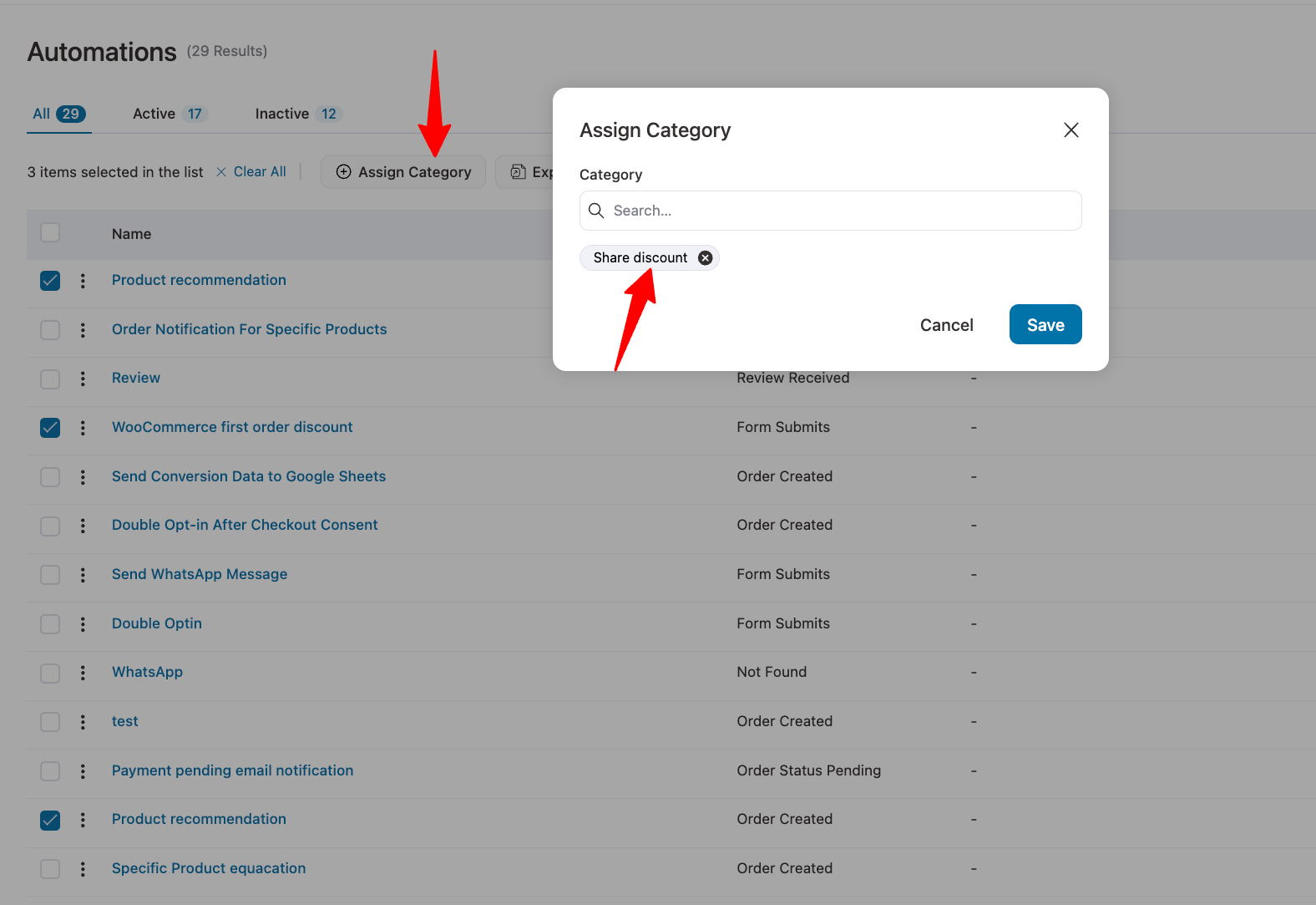 You can also add categories to automations in bulk. Select the automations, then click the Assign Category button at the top. Next, you can add one or multiple Automations like you did earlier.