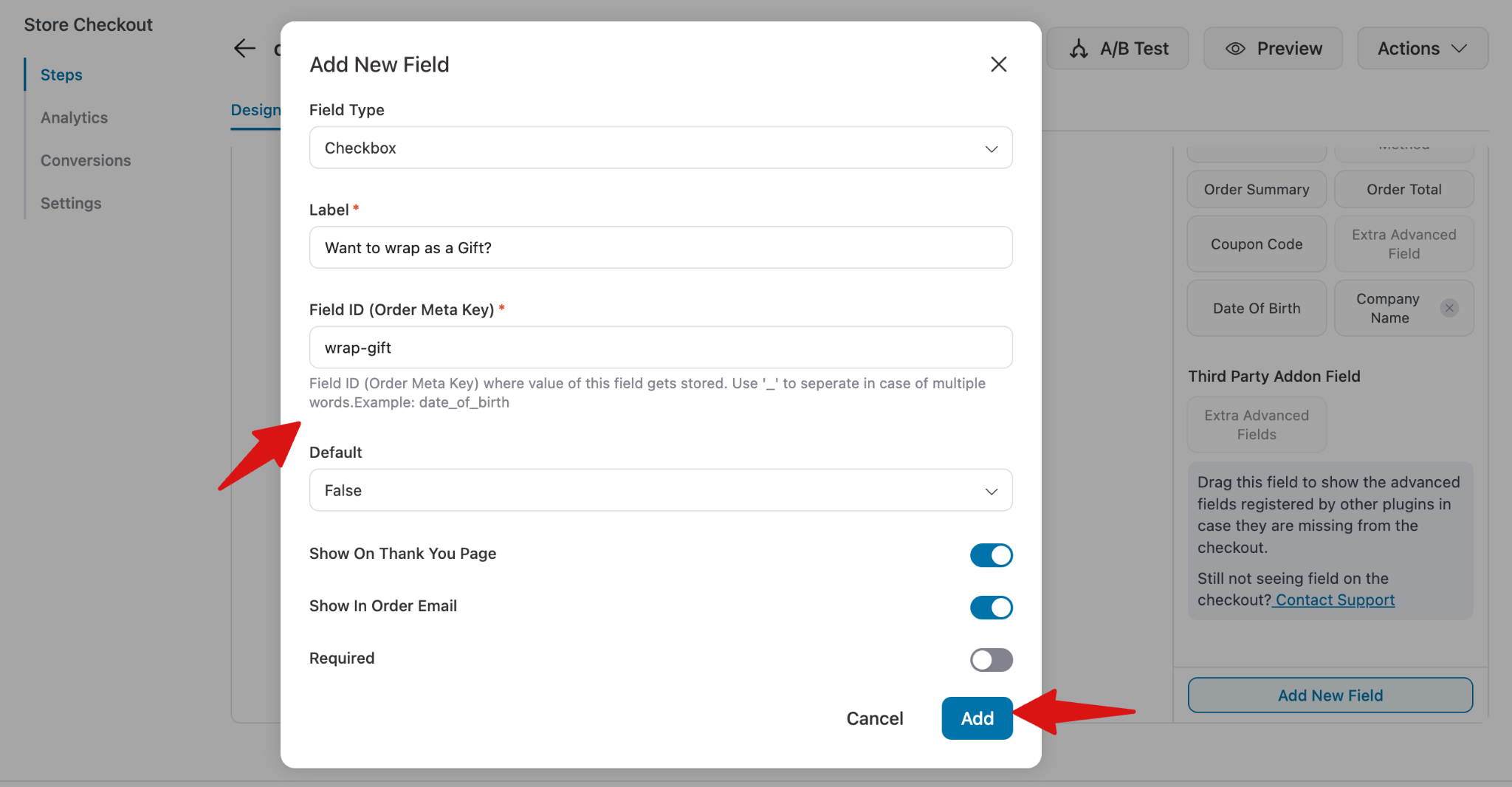 Make sure to hit “Add” and then save the checkout page with custom fields as well.