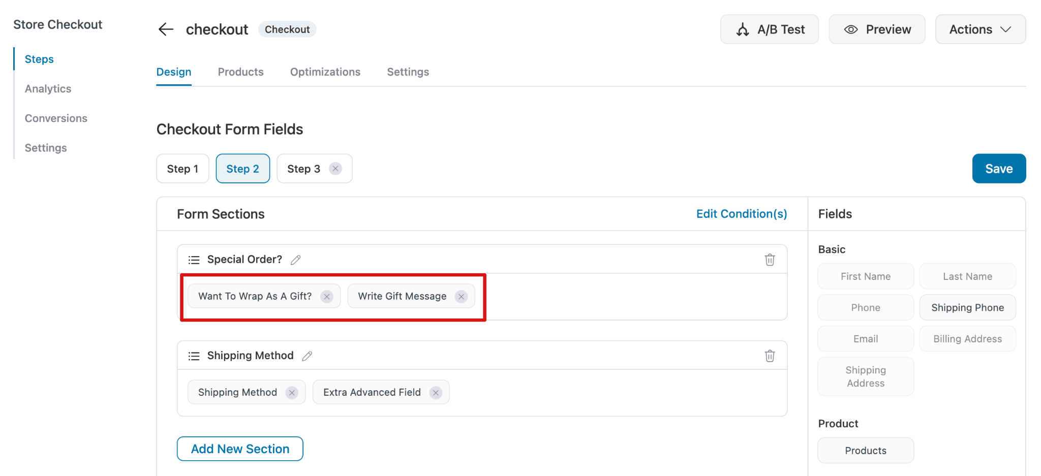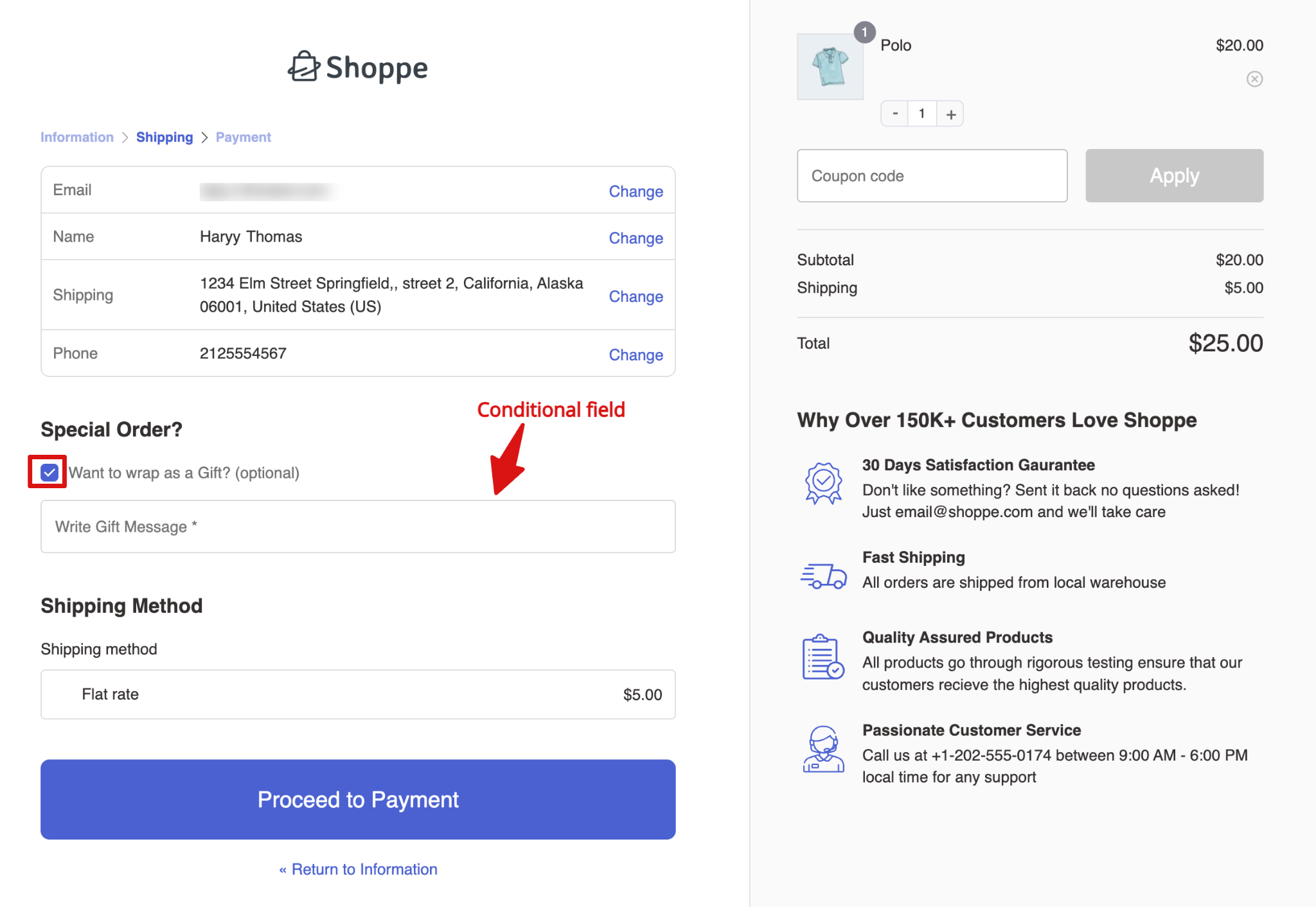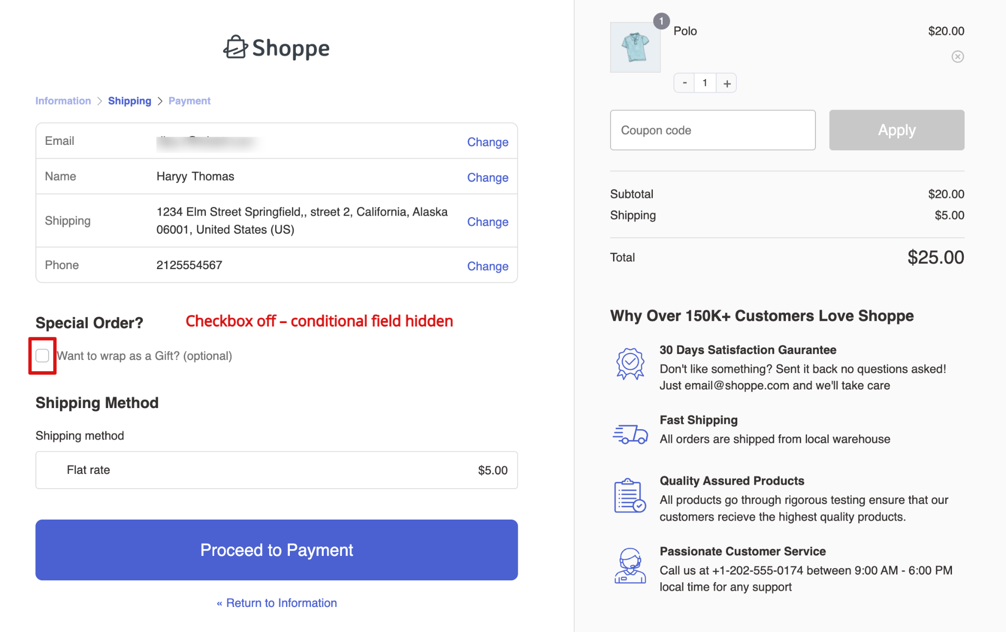 For this example, we’ll use a common scenario: if a customer wants to wrap their purchase as a gift, they can check a box to indicate this choice. Once the checkbox is selected, a new field will appear asking them to provide a special message for the gift.