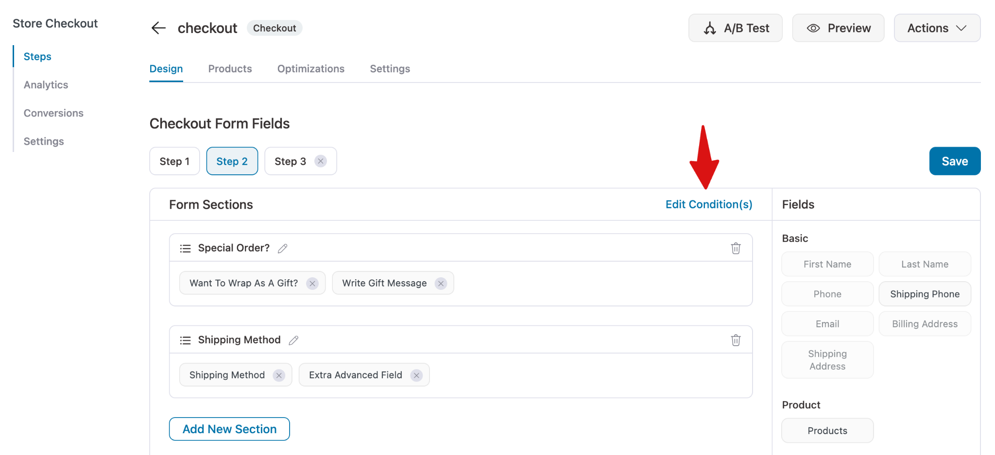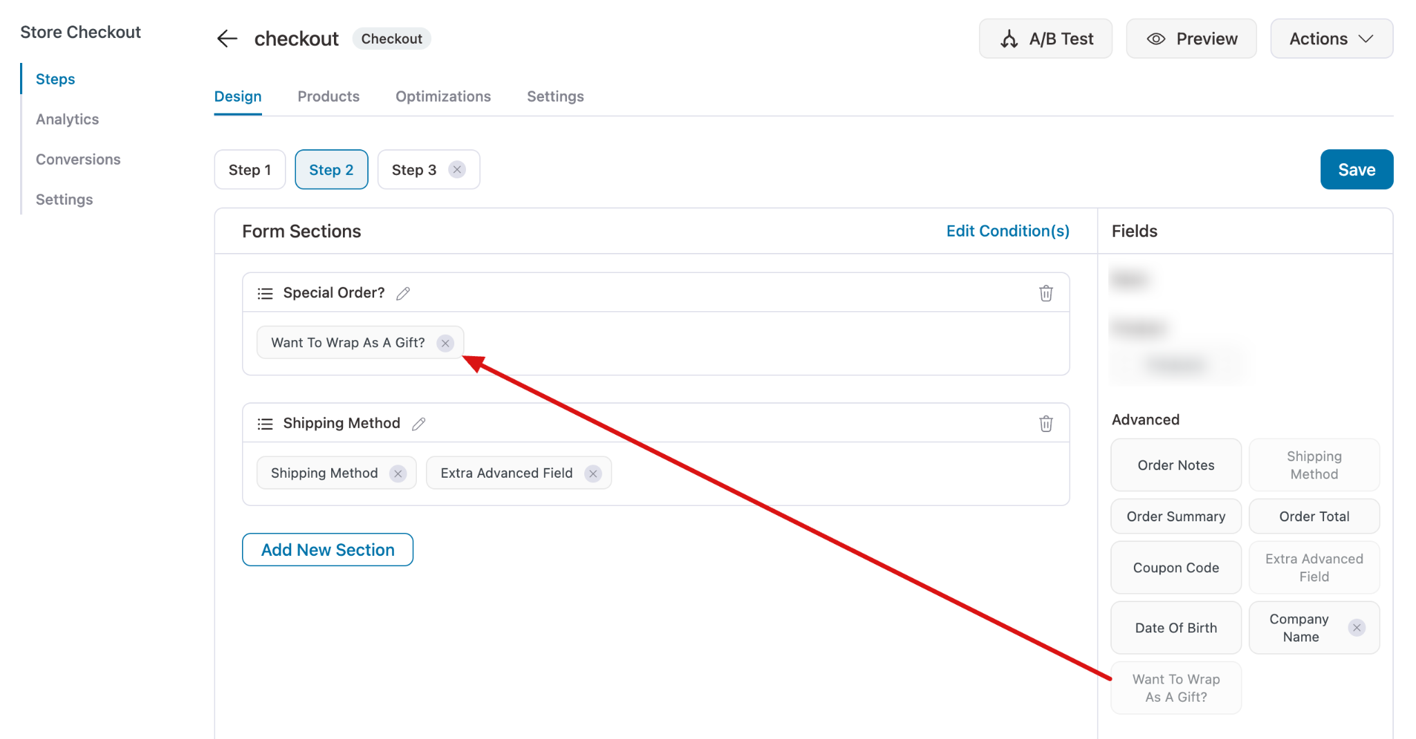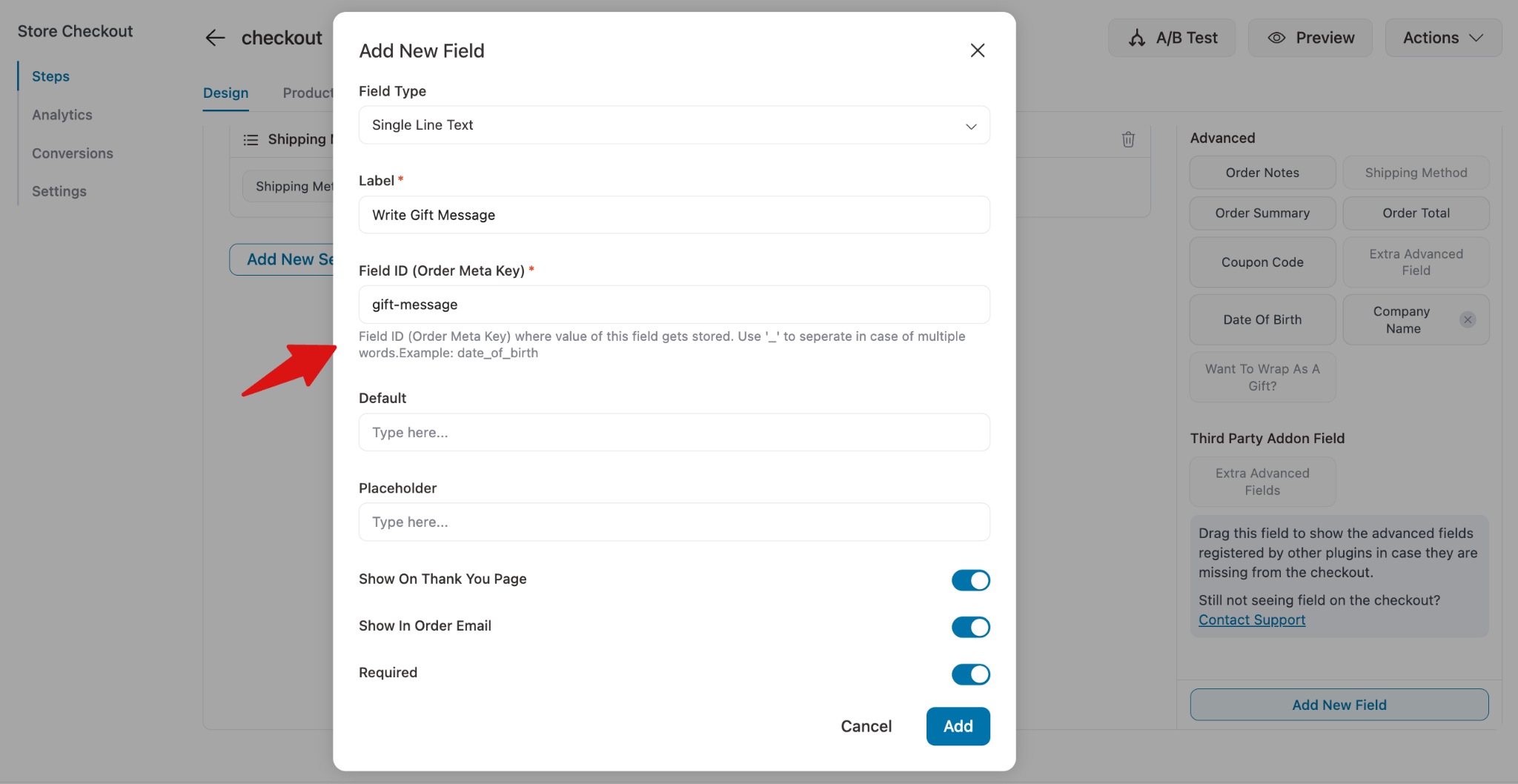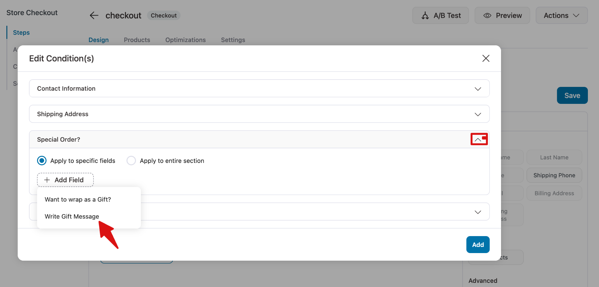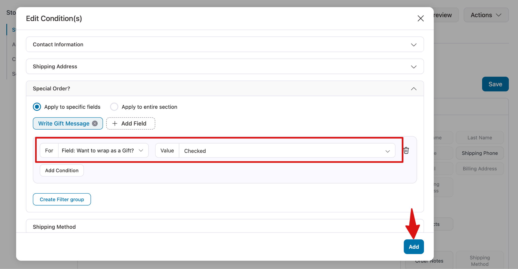 Now, to make the “Write Gift Message” field appear only when people check the “Want to wrap as a Gift?” field, we will add a condition.