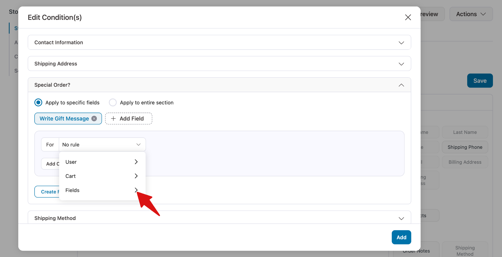 Next, expand the Section that contains the conditional field, and select “Apply to specific fields”. Then hit “+ Add Field” and select the field you want to make conditional.
