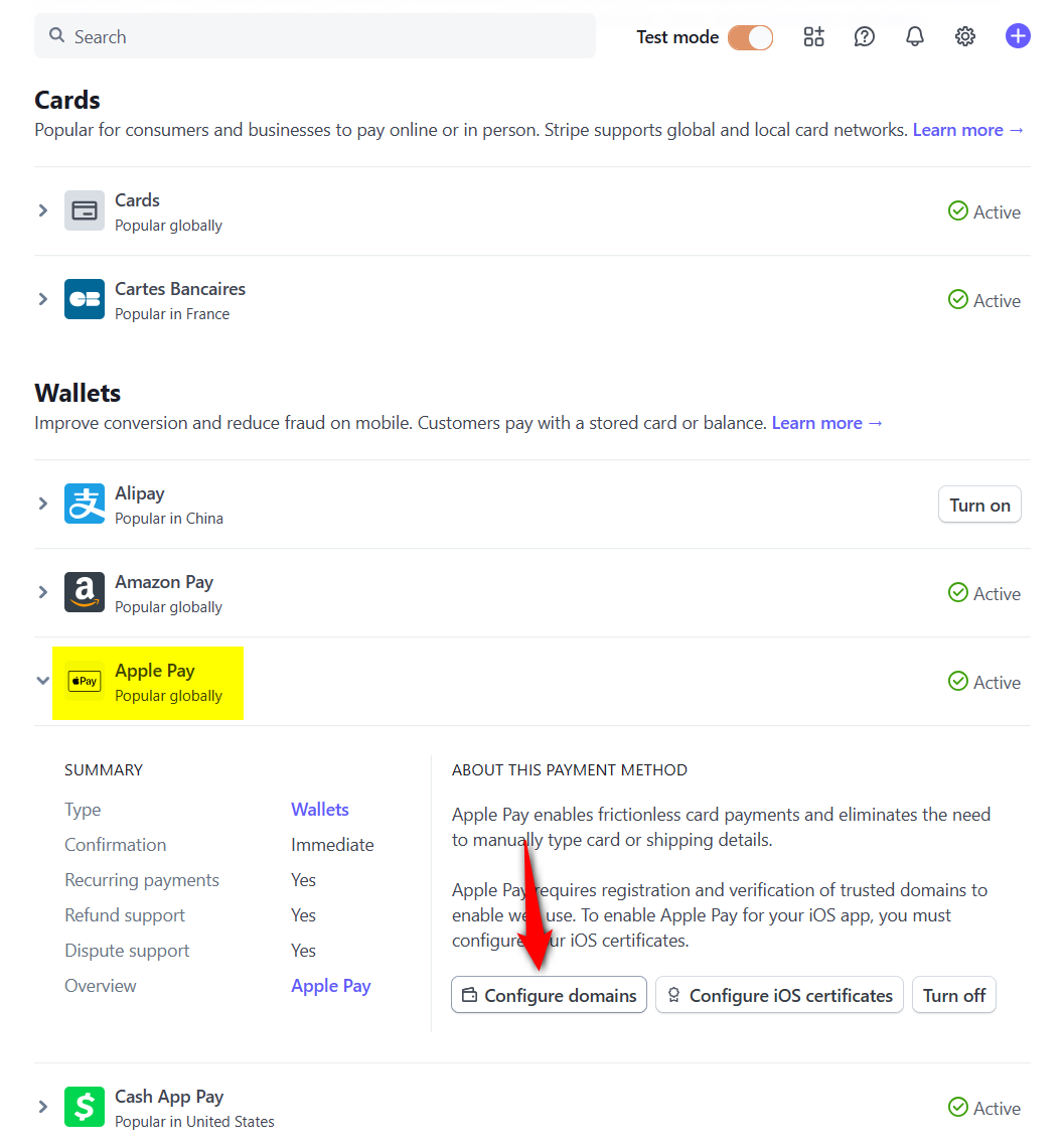 - Under the Payment Methods tab, scroll down to the Wallets section and click on the ‘Configure domains’ button under Apple Pay.