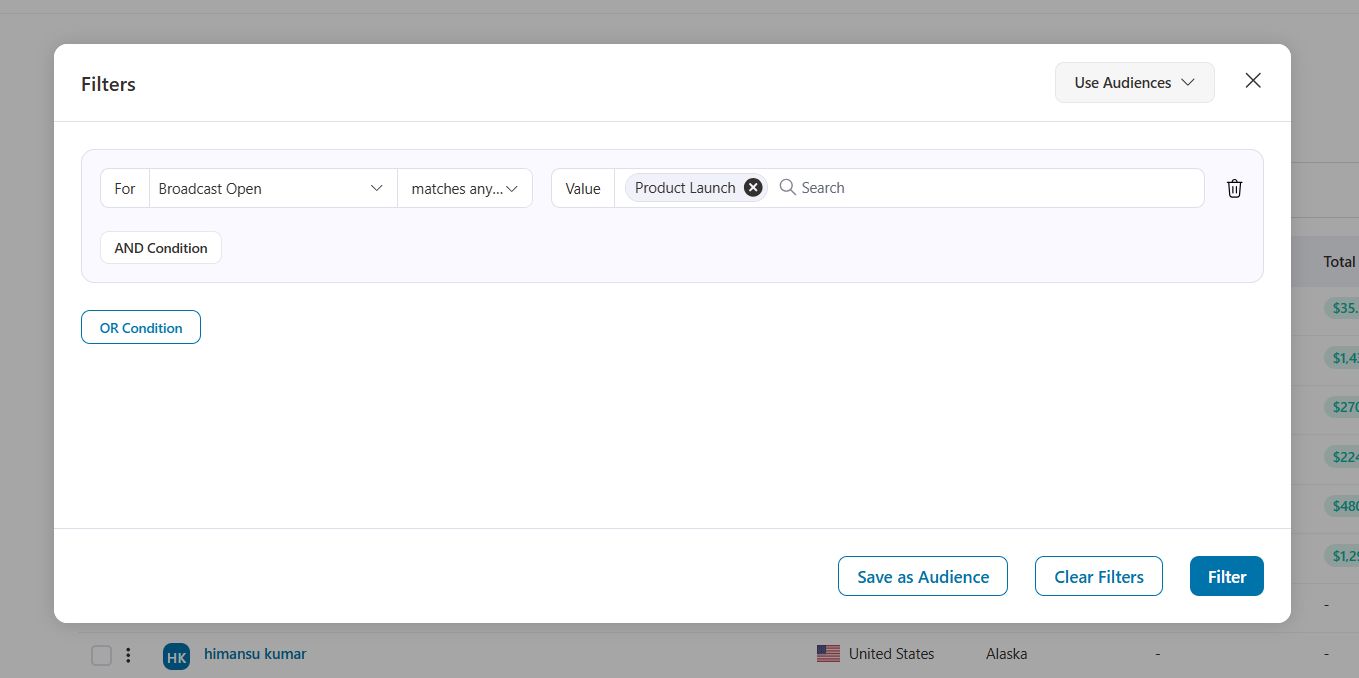 - Broadcast segmentation: When selecting recipients for a broadcast campaign, you’ll see the new filter UI for precise audience targeting with full AND/OR capabilities.