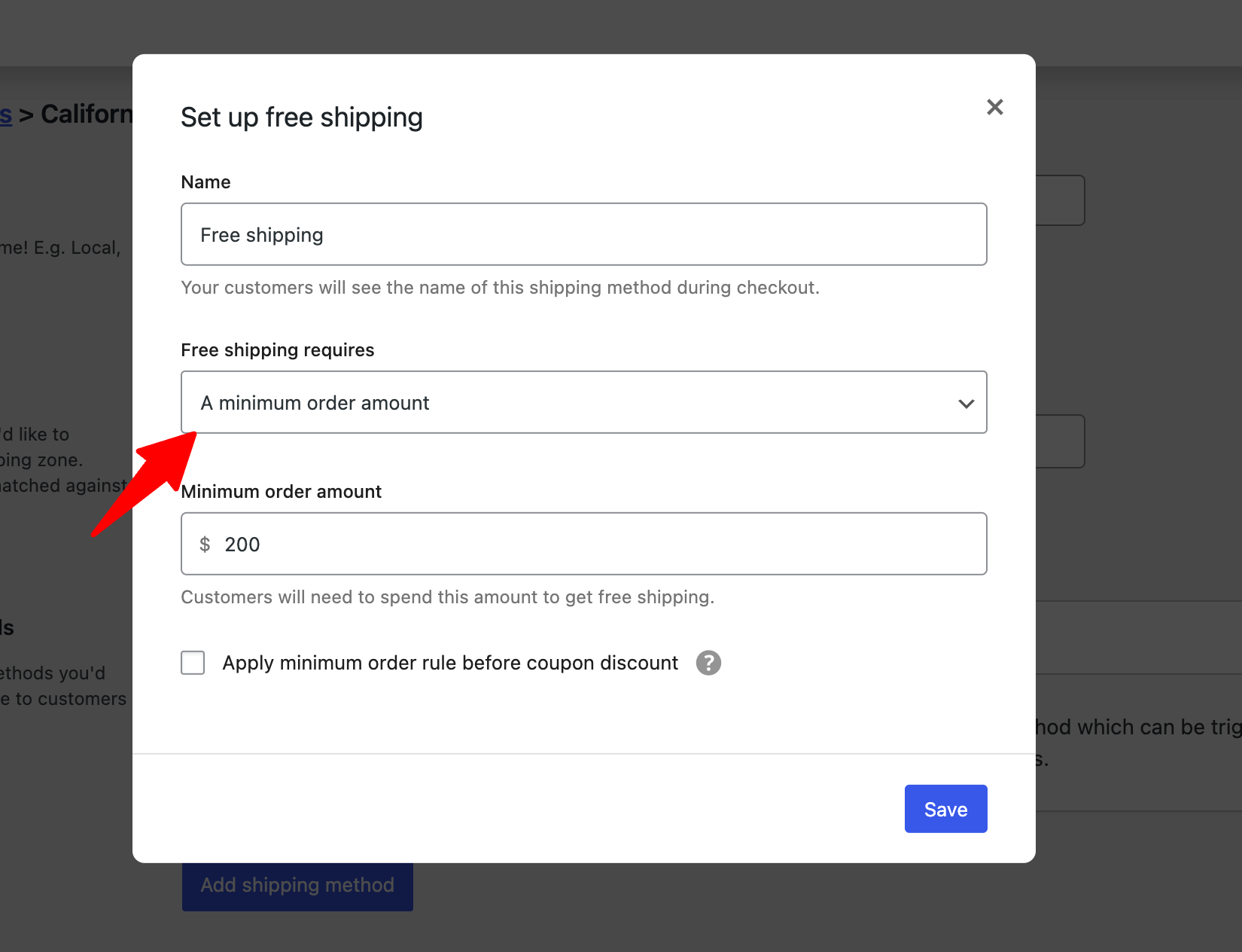 You can offer your shoppers a free shipping cart discount when the minimum cart price reaches a certain value.
